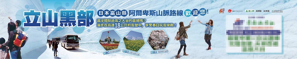 立山黑部主打春季雪牆 捷運海報廣告熱烈募集中立山黑部每年春季重頭戲~雪之大 谷即將於4月16日盛大開通,為使 立山黑部形象更深植國人心中,立山黑 部預計自2月下旬進行同業合作廣告以 推廣春季旅遊魅力,針對台北都會區實 施兩列捷運車廂海報專車,限額為72面 海報,歡迎意者洽詢向日遊。...